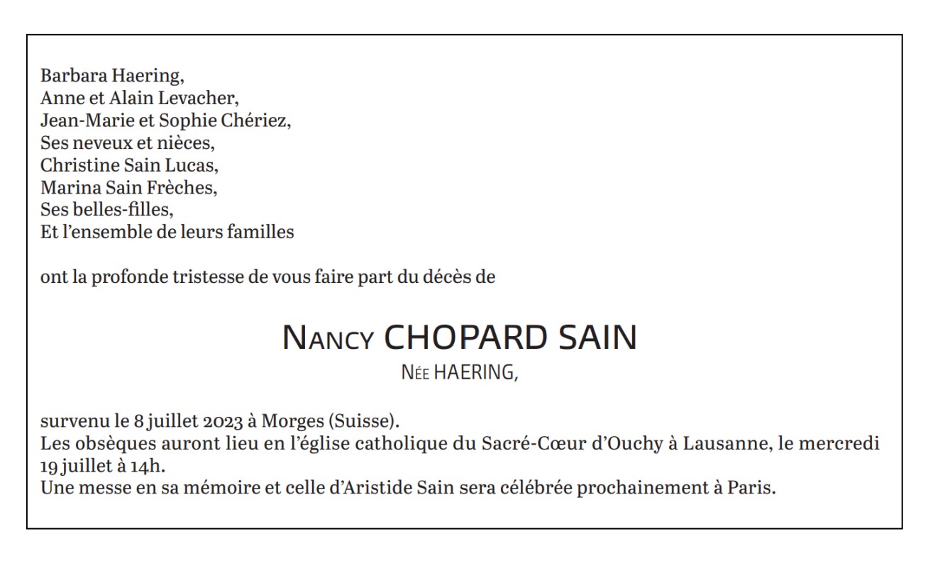 Nancy CHOPARD SAIN née Haering 12 avr. 1922 - 08 juil. 2023 Avis mortuaire PFG Télecharger PDF Partager sur: Galerie PreviousNext PreviousNext