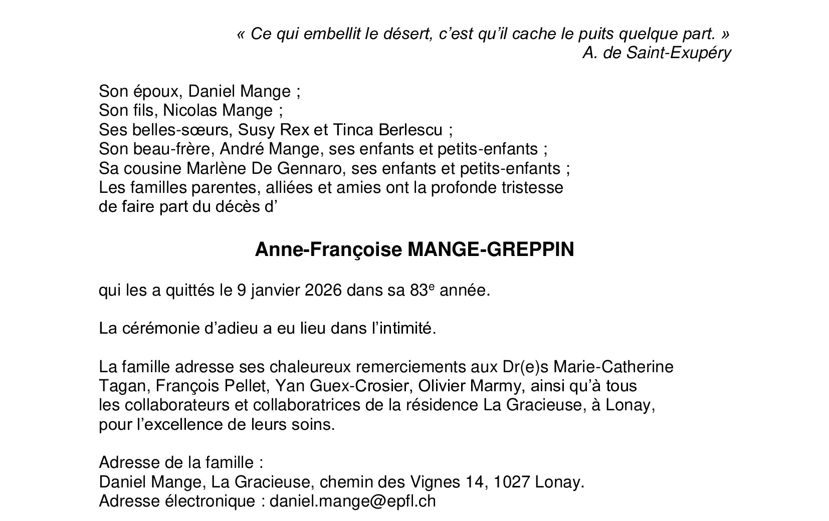 Madame Anne-Françoise Mange-Greppin